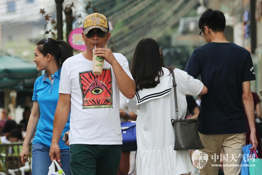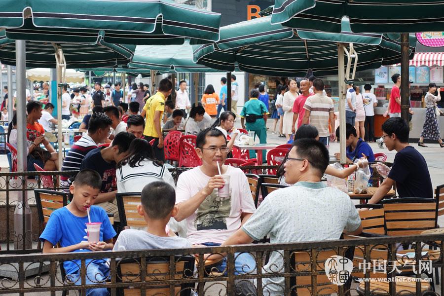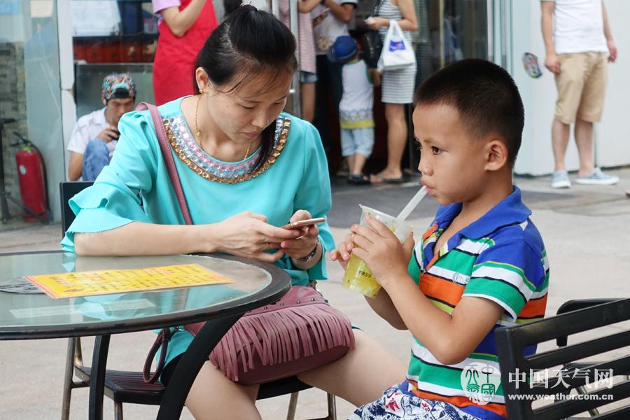 商业街边的小店前,市民喝冷饮纳凉(摄影:刘英轶)