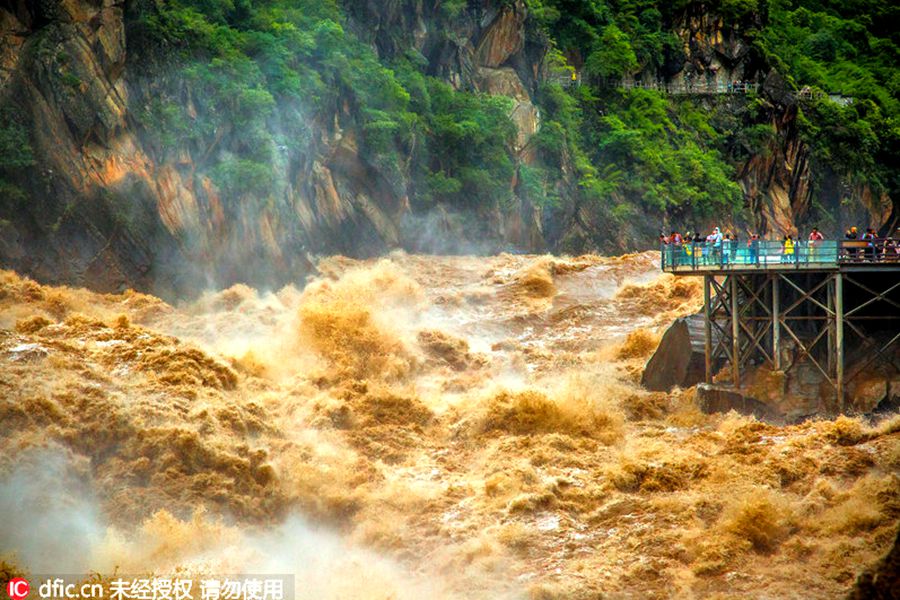 2016年7月15日,云南迪庆。虎跳峡景区人头攒动,来自五湖四海的游客聚集于此,观赏厄尔尼诺“淫威”下的虎跳峡“超级山洪”。在与惊涛骇浪咫尺之隔,已被翻腾的巨浪打湿的木制栈道上,游客们不时拿出手机相机拍照,大呼过瘾。游客在翻腾的江水旁拍照留念。黄逗/东方IC