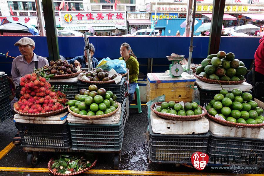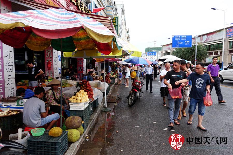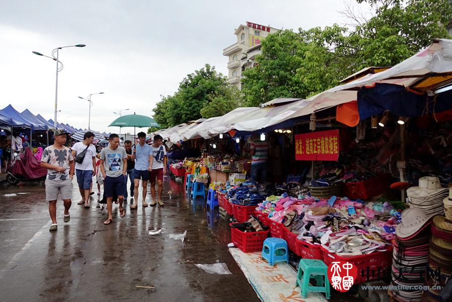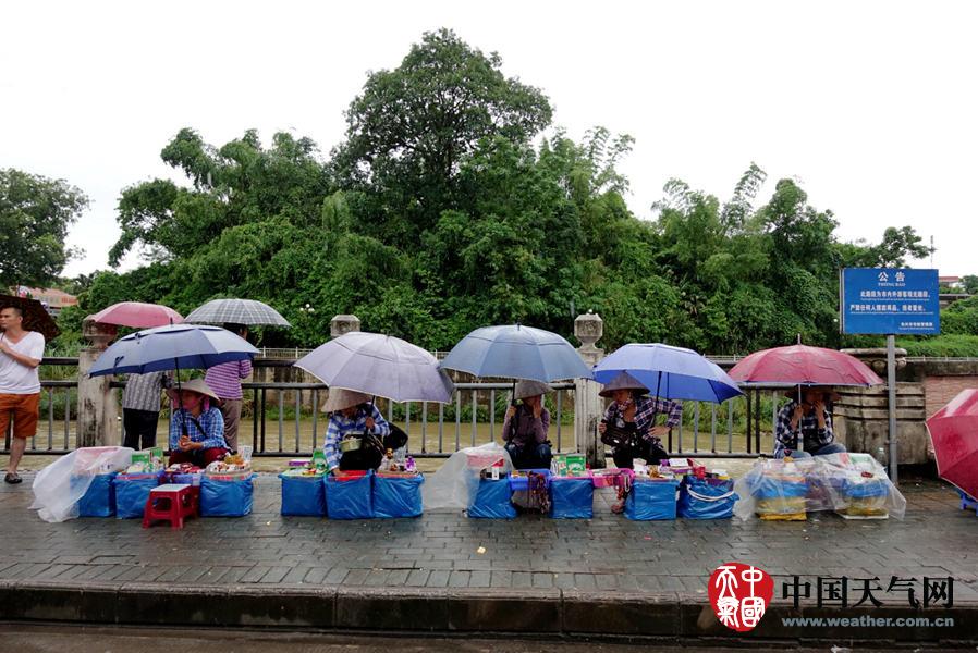 天空下着小雨,清凉舒适,小商贩们撑着伞坐成一排摆摊(摄影:陈国弟)