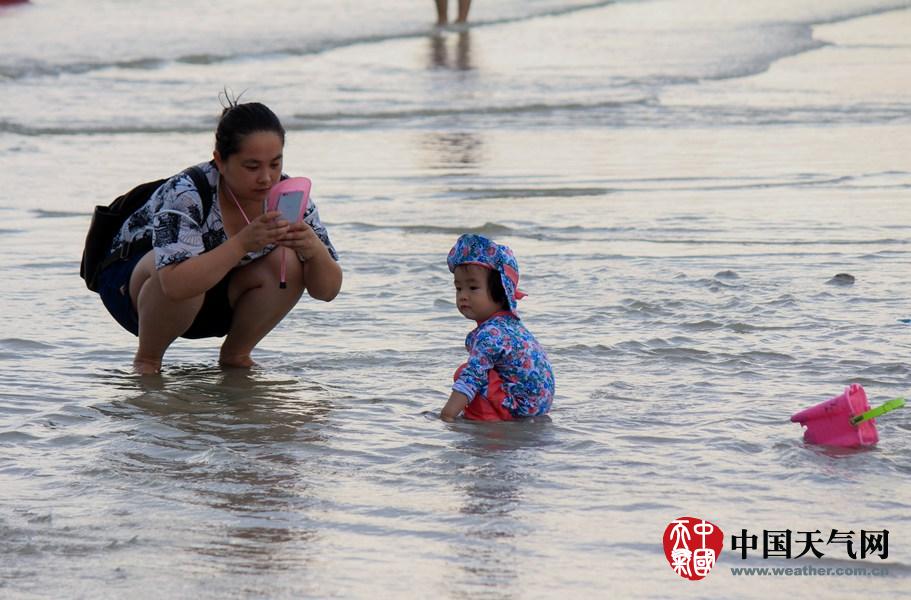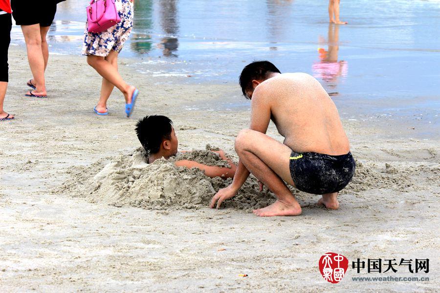游客在沙滩上玩沙子。(摄影:林健文)