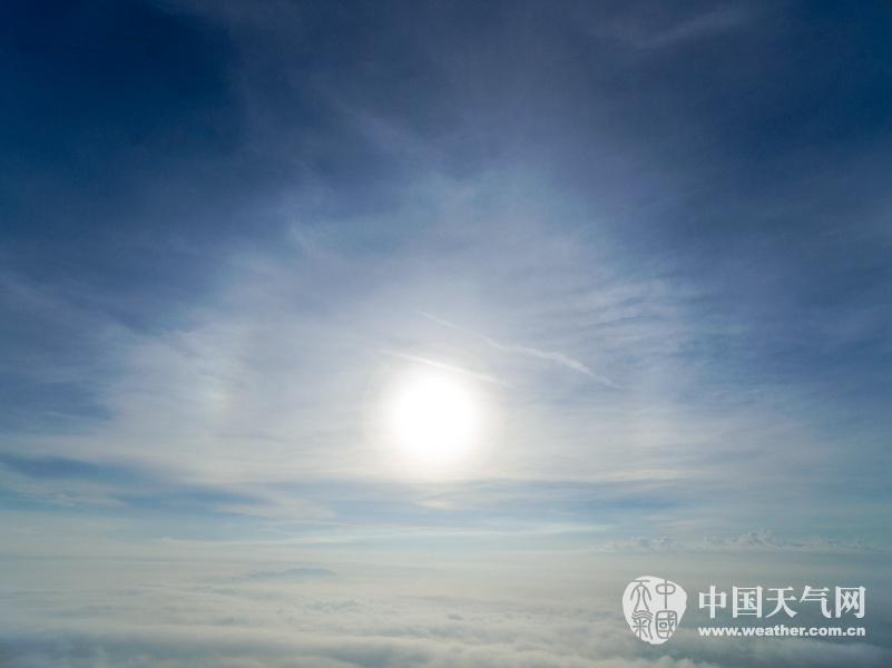 2016年8月10日清晨,无人机漫步云端航拍钦州上空的云海日晕奇观。(摄影:李斌喜)