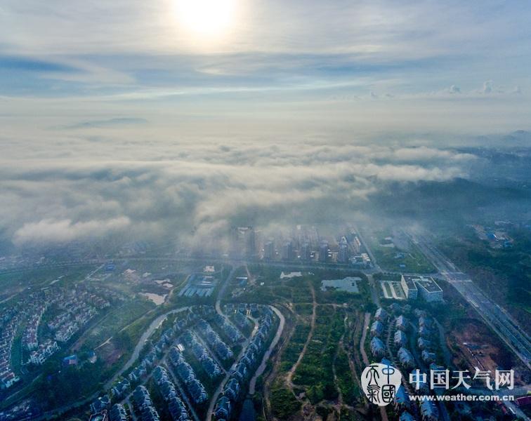 太阳升起,钦州市钦园小区上空云雾若隐若现,美不胜收。(摄影:李斌喜)