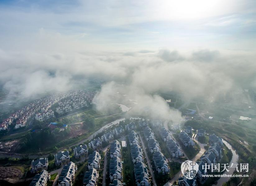 空中鸟瞰钦州市钦园小区上空云雾撩绕,宛若仙境。(摄影:李斌喜)