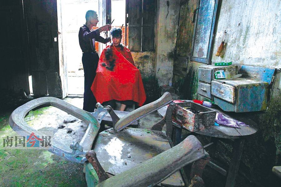 残破的运江理发店里,80岁的老理发师龚桂明还在为留守老居民服务。(摄影:张存立)