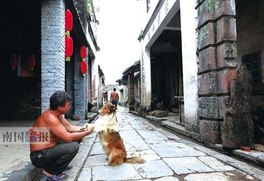 古镇青石板老街上,闲暇的居民正和一只牧羊犬逗趣。(摄影:张存立)