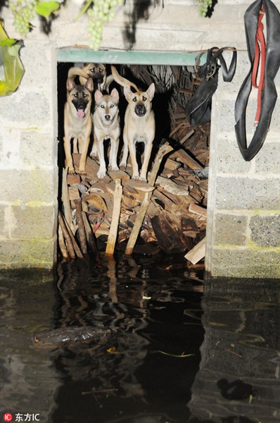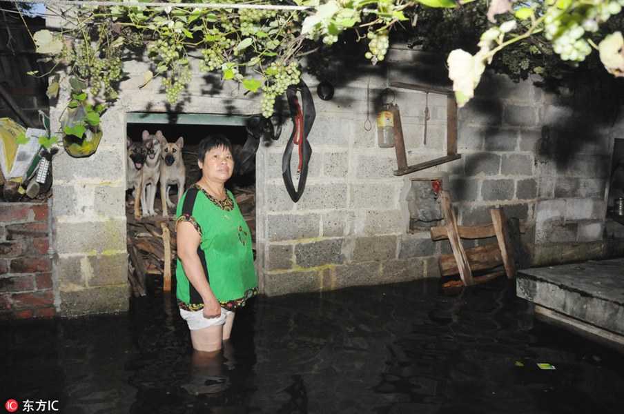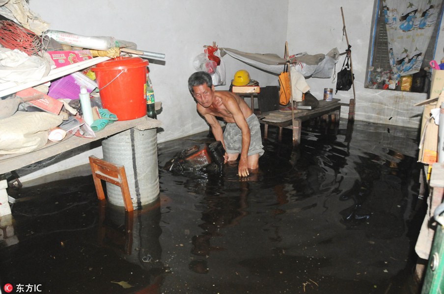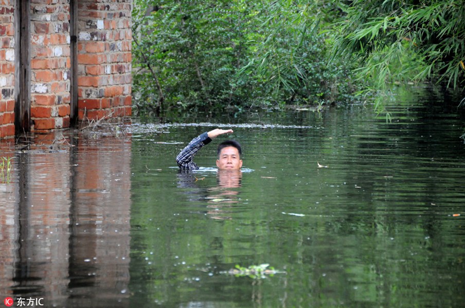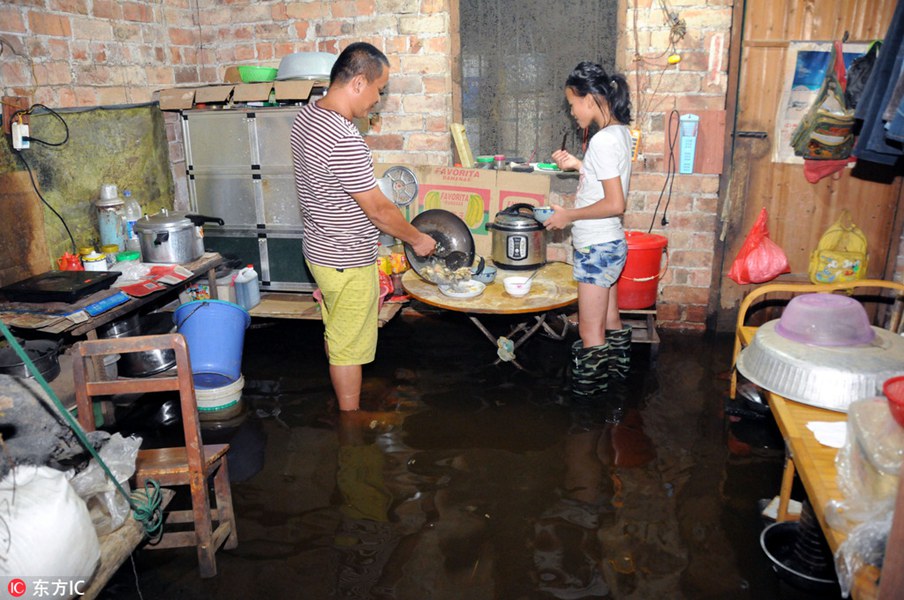 村民家中完全被内涝积水浸泡,在水中吃喝。