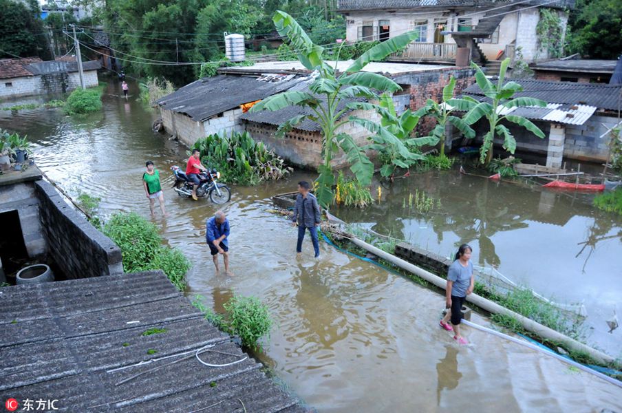 广西南宁一村庄被雨水浸泡 村民在水中吃住