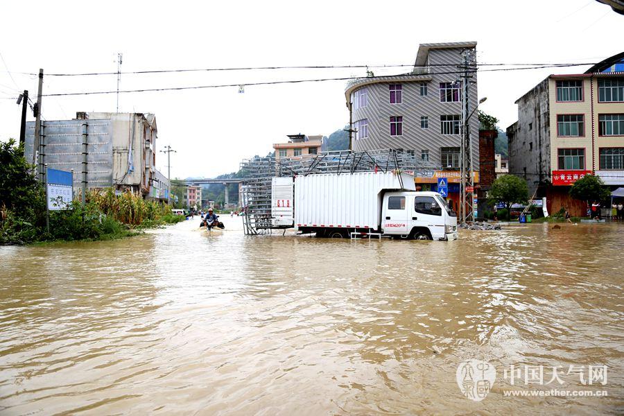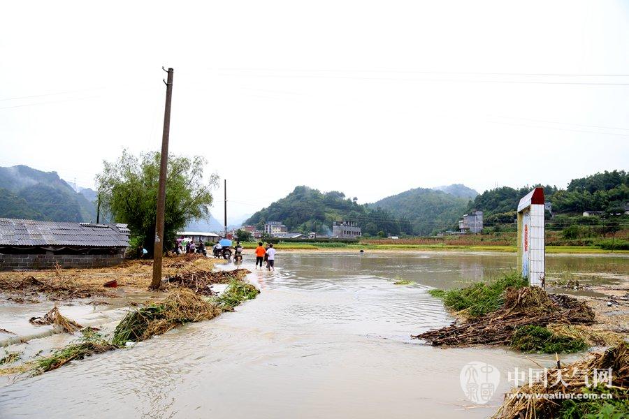 城关镇铜江河河水上涨,漫过道路。(摄影:吴其仁)