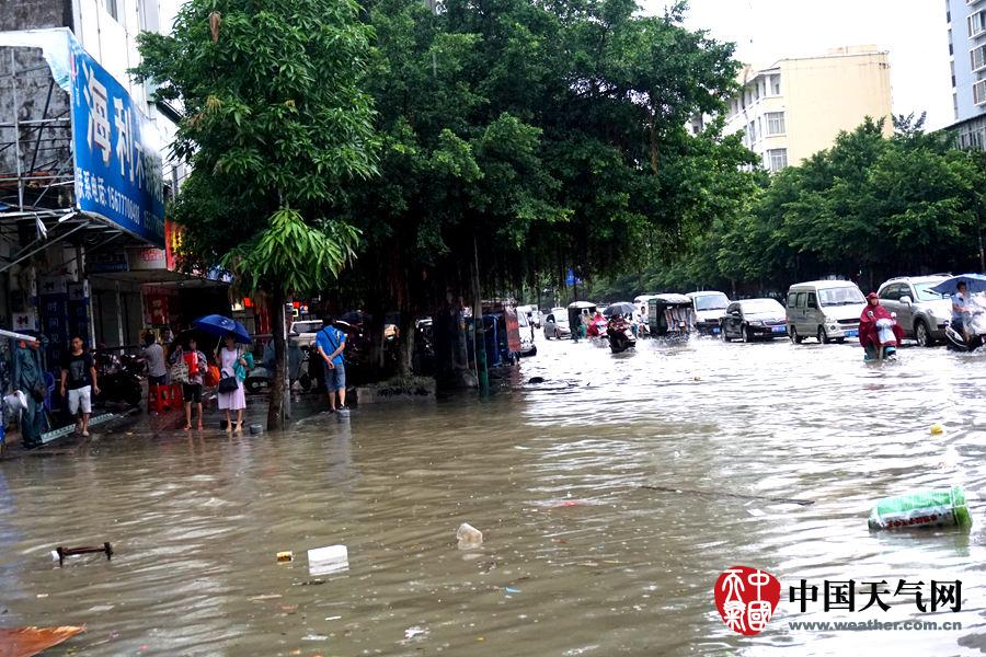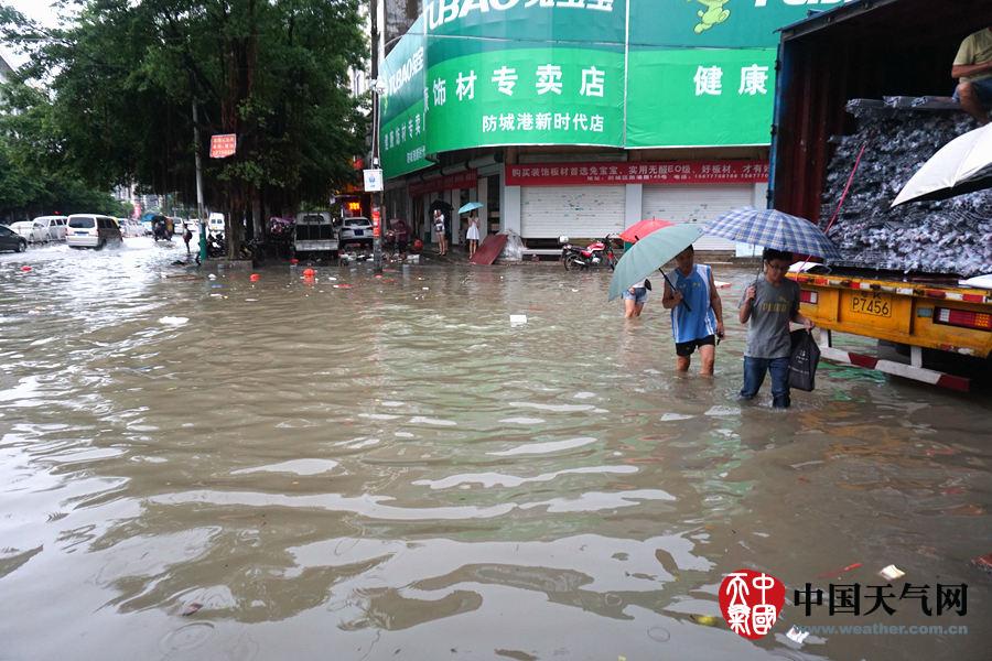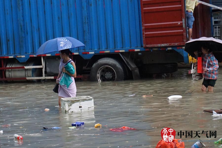防港路中新路口受浸严重,垃圾到处漂流。(摄影:吴兴高)