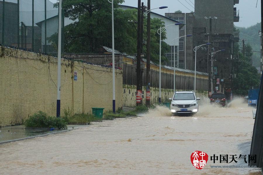 建民路一辆小车涉水艰难前行(摄影:刘金裕)