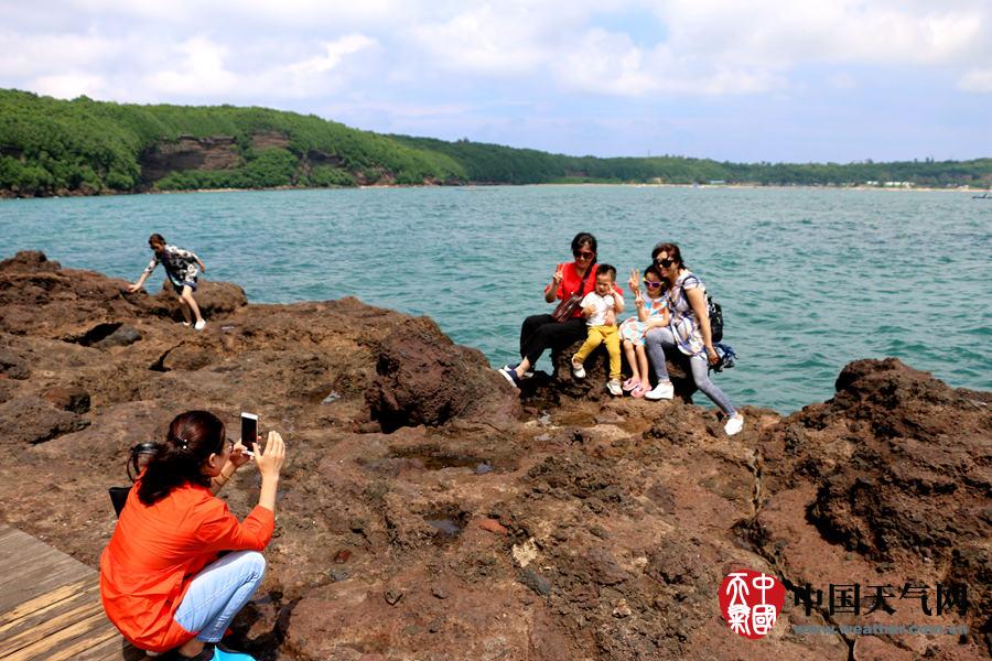 游客在红褐色的礁石上合影留念。(摄影:郑武超)