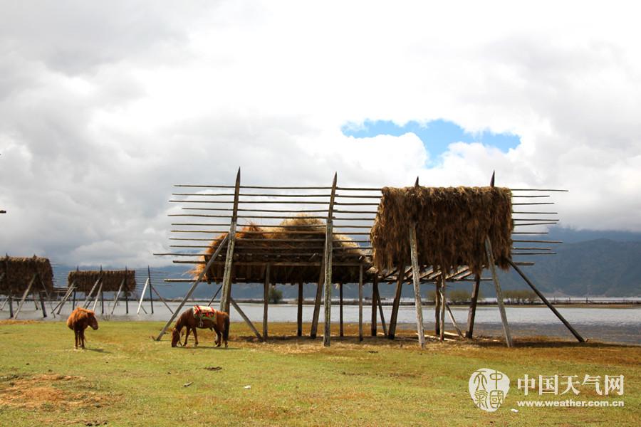 马儿在青稞架下悠闲的吃草(摄影:周冬静)