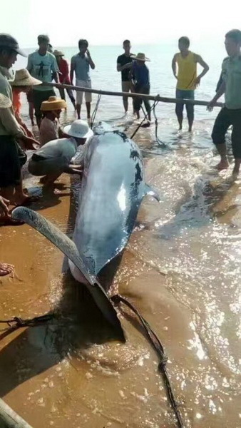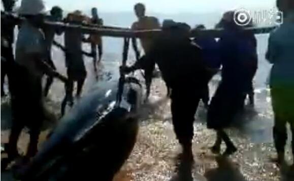 10月23日下午2时许,一条重达几吨的鲸鱼在雷州市纪家镇豪郎良坡村海滩搁浅,当地村民发现后,叫来全村在家的少壮村民与当地的后郎边防派出所官兵一起,经过一个多小时的努力,终于合力把这条几吨重的鲸鱼抬回大海,挽救了其生命。供图:广东日报