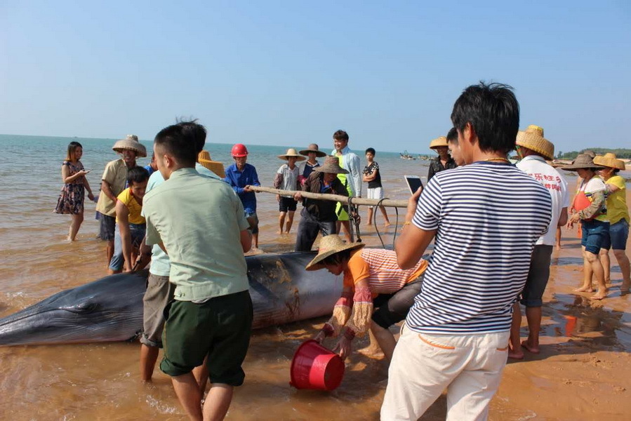 在营救过程中,村民有的给鲸鱼撑伞遮阳,有的不断挖深沙滩,将海水引入搁浅处给鲸鱼,并不断用水桶盛海水为鲸鱼淋身,之后,众村民与边防官兵们合力将鲸鱼抬起,小心翼翼地将鲸鱼移向海水区。经过一个多小时的努力,鲸鱼终于被移向海水深处。