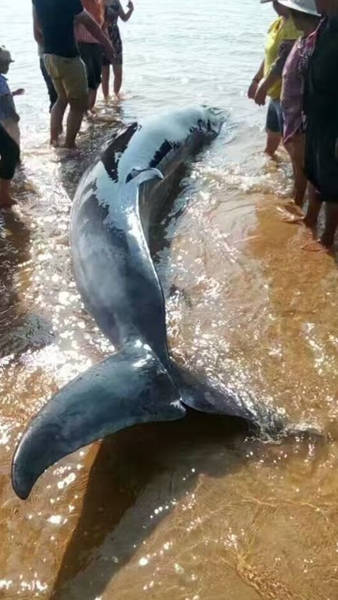 据介绍,当天下午2时左右,当地太阳正猛,纪家镇豪郎良坡村民肖武发现这条长5米多、重达数吨的通身呈黑灰色鲸鱼时,搁浅在海滩的它,也许是曝晒过久、缺水等原因,已是奄奄一息。