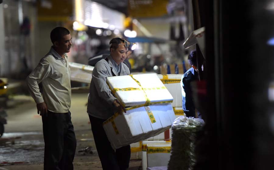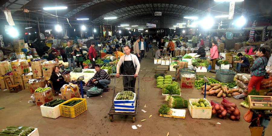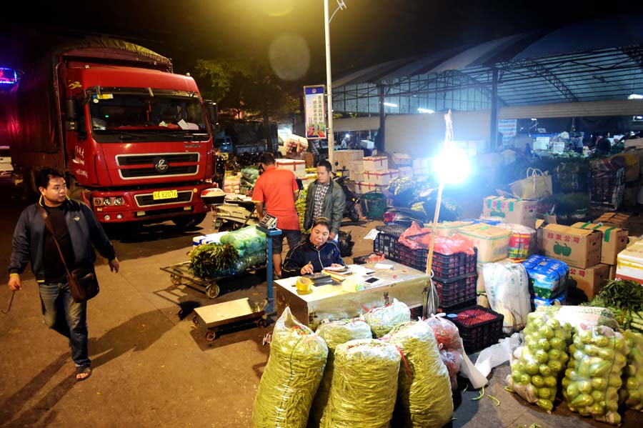10月30日凌晨,菜贩在钦州鸿发市场内紧张工作。