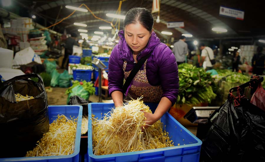 10月30日凌晨,一名菜贩在钦州鸿发市场出售豆芽。