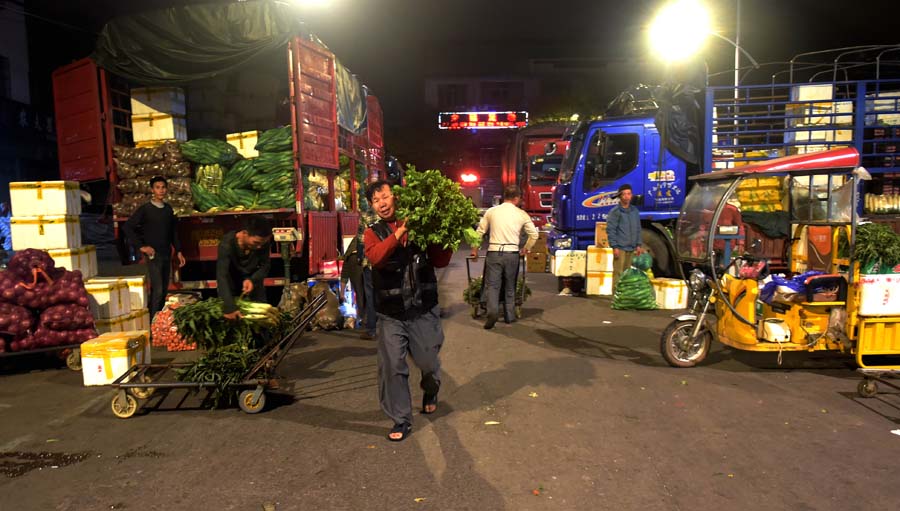 10月30日凌晨,菜贩在钦州鸿发市场搬运蔬菜。