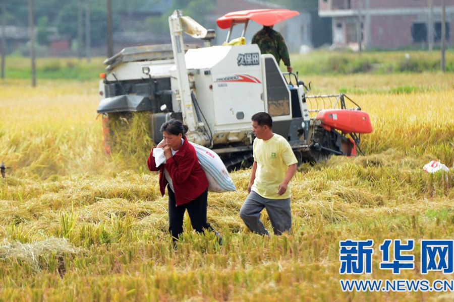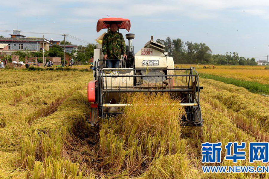 11月2日,来自河南的收割机队伍在广西钦州市康熙岭镇那沙村帮助收稻谷。(摄影:张爱林)