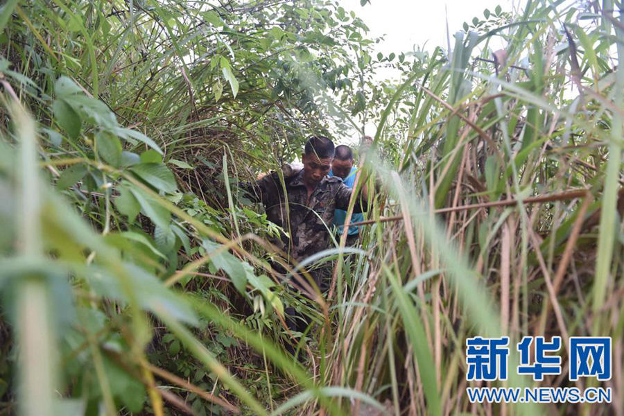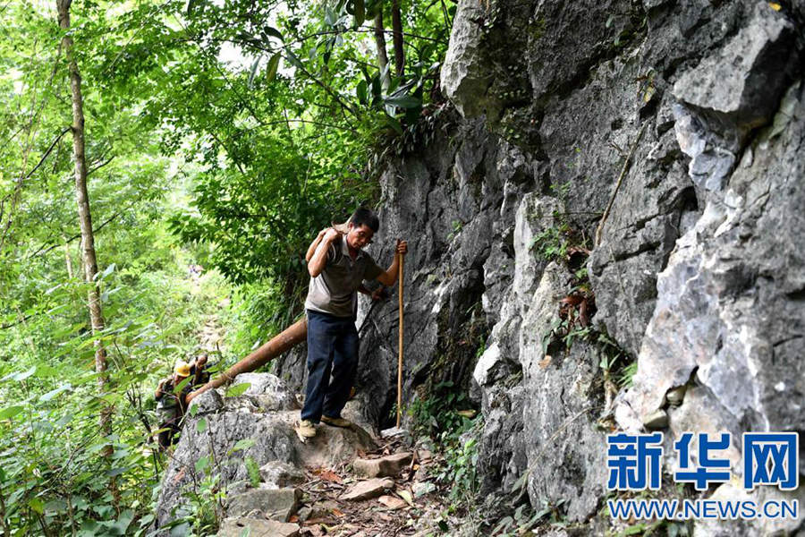 8月10日,在广西大化瑶族自治县板升乡弄雷村,工人们为抗旱饮水工程抬水管在山路上艰难挺进。(摄影:黄孝邦)