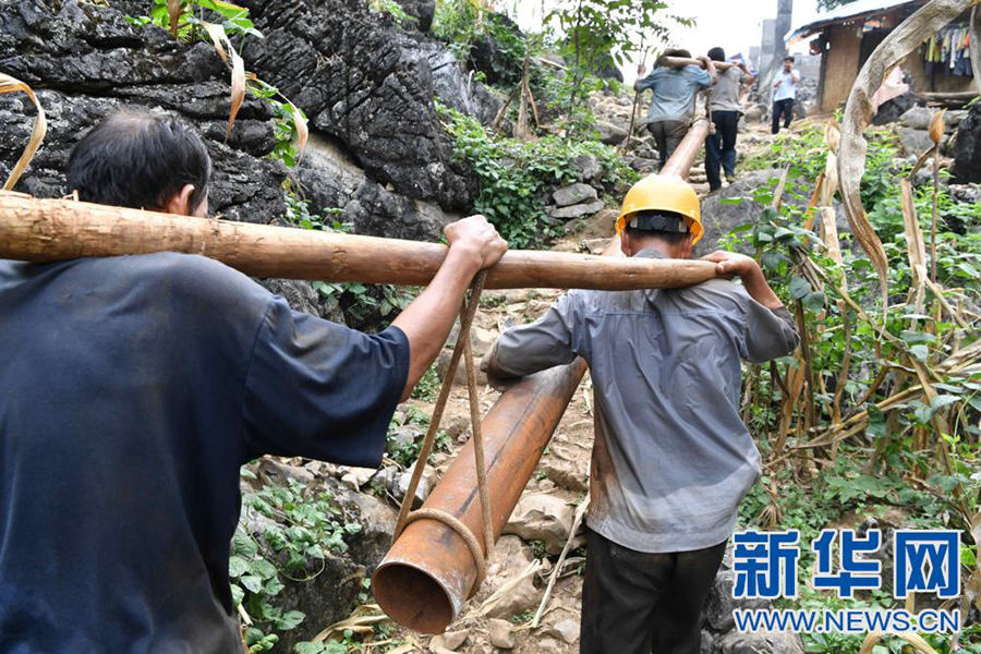 8月18日,在广西大化瑶族自治县板升乡弄雷村,工人们为抗旱饮水工程抬水管在山路上艰难挺进。(摄影:黄孝邦)