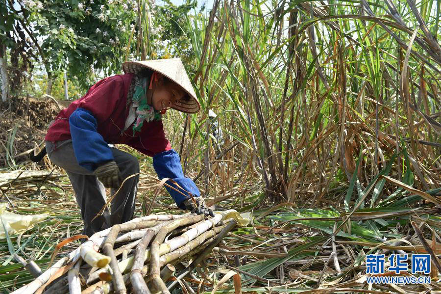 11月18日,村民在广西崇左市江洲区新和镇捆扎新砍收的甘蔗。新华社记者 周华 摄