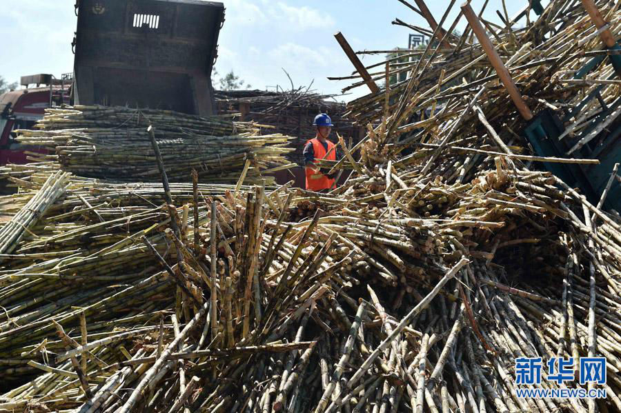11月18日,一名工人在广西崇左市江洲区一家糖厂查看甘蔗装卸。新华社记者 周华 摄
