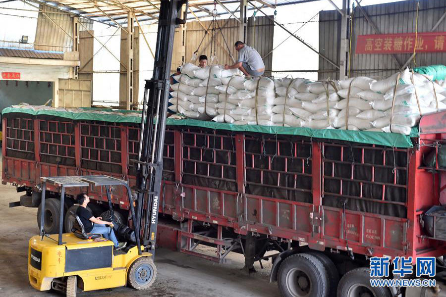 11月18日,工人在广西崇左市江洲区一家糖厂装运新产的白糖。新华社记者 周华 摄