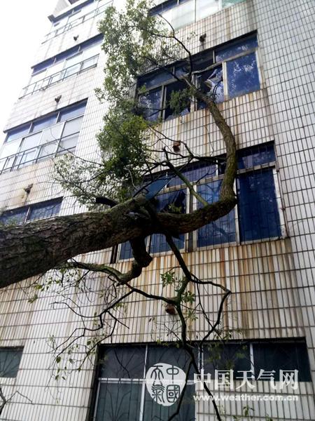 折腰的老树干撞碎了临楼的玻璃窗户(摄影:李陶桂)