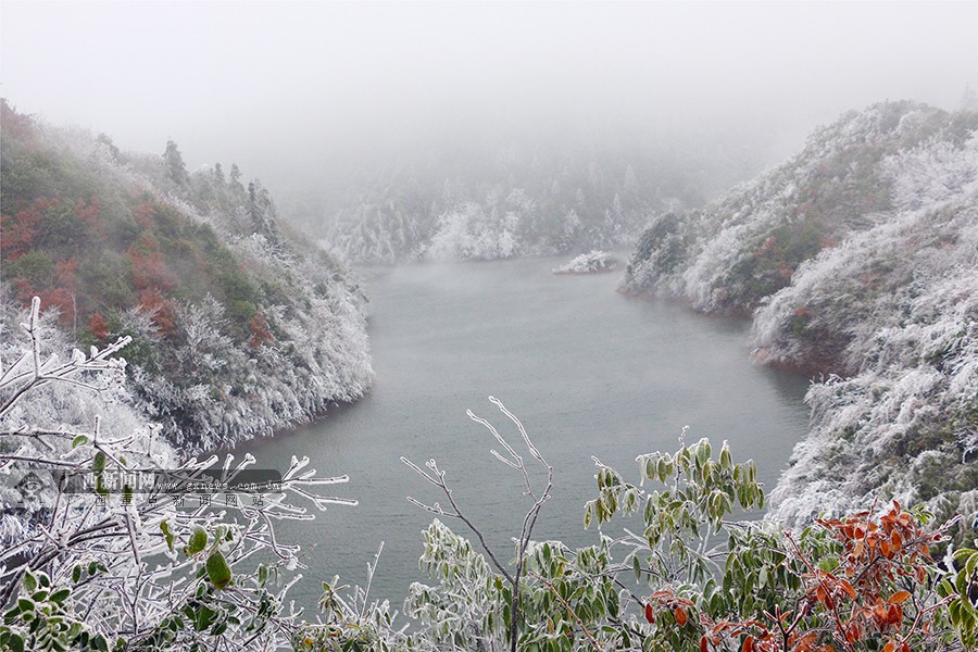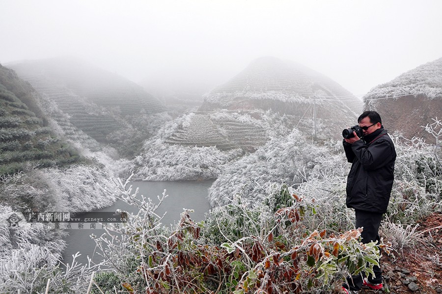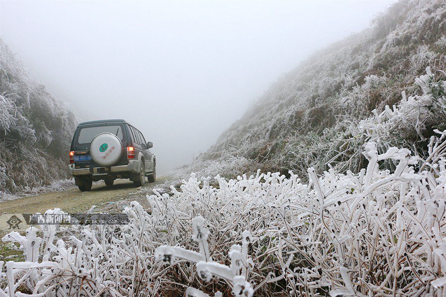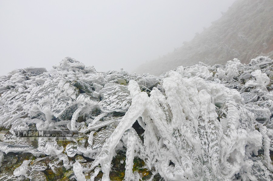 高山上浓雾弥漫,白茫茫的一片冰雪世界。广西新闻网通讯员刘勇华 吴婷婉供图