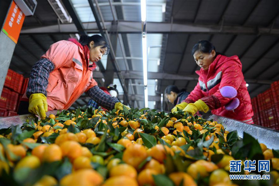 11月26日,在富川瑶族自治县一家水果加工厂,工人在分拣蜜橘。