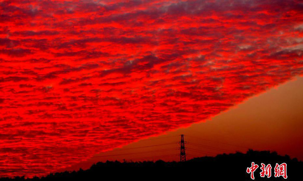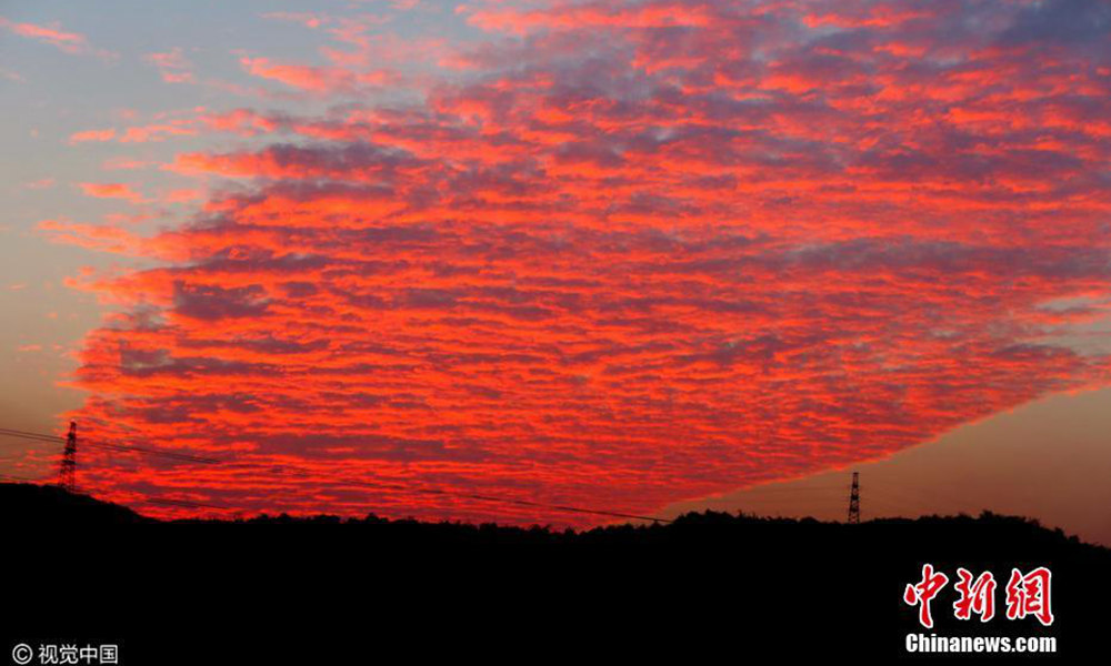 2016年12月5日,广西壮族自治区桂林市全州县上空出现大面积罕见壮观、唯美绚丽的“火烧云”映红天际,令人叹为观止。图片来源:视觉中国