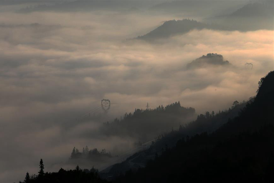 这是12月7日在广西柳州市三江侗族自治县八江镇布央村拍摄的云海。当日是“大雪”节气,广西柳州市三江侗族自治县八江镇布央村山谷内云雾缭绕,宛若仙境。(摄影:吴练勋)