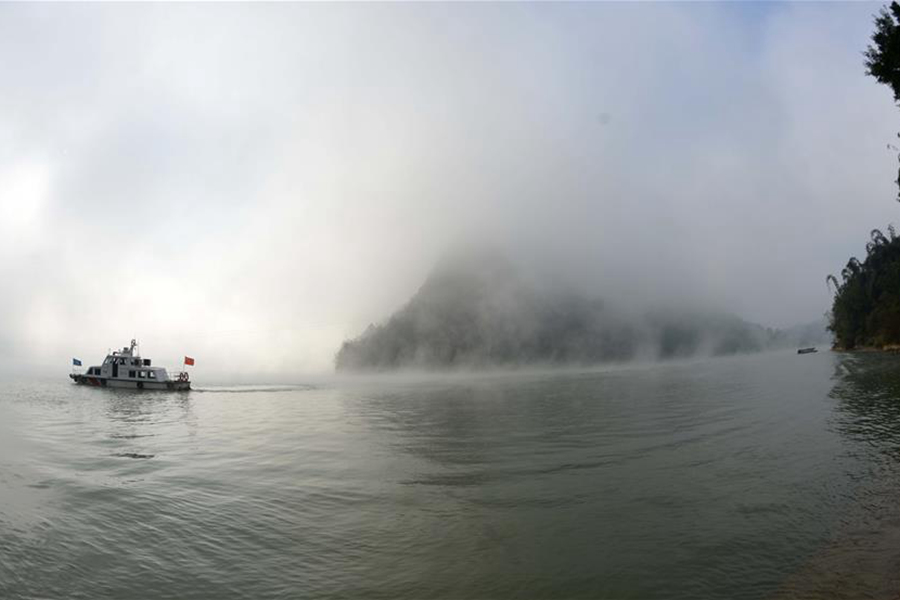 12月7日,一艘船在广西柳州市三江口江面上行驶。当日是“大雪”节气,广西柳州市三江侗族自治县老堡乡三江口江面雾气蒸腾,船只往来穿梭,若隐若现。(摄影:潘志祥)