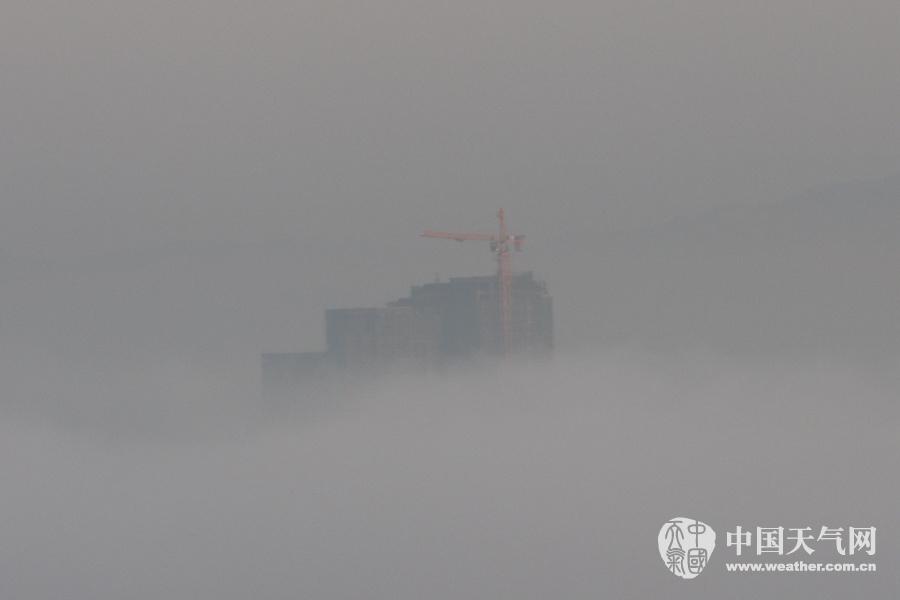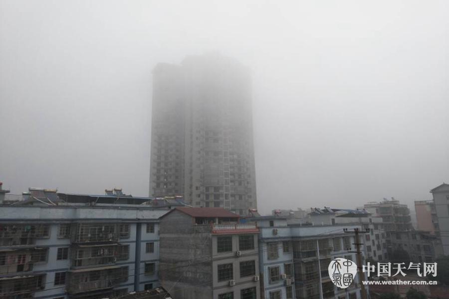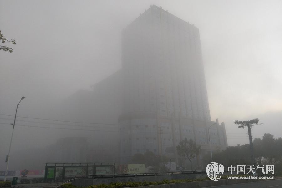梧州市内被浓雾拦腰截断的楼房。(摄影:梁文希)