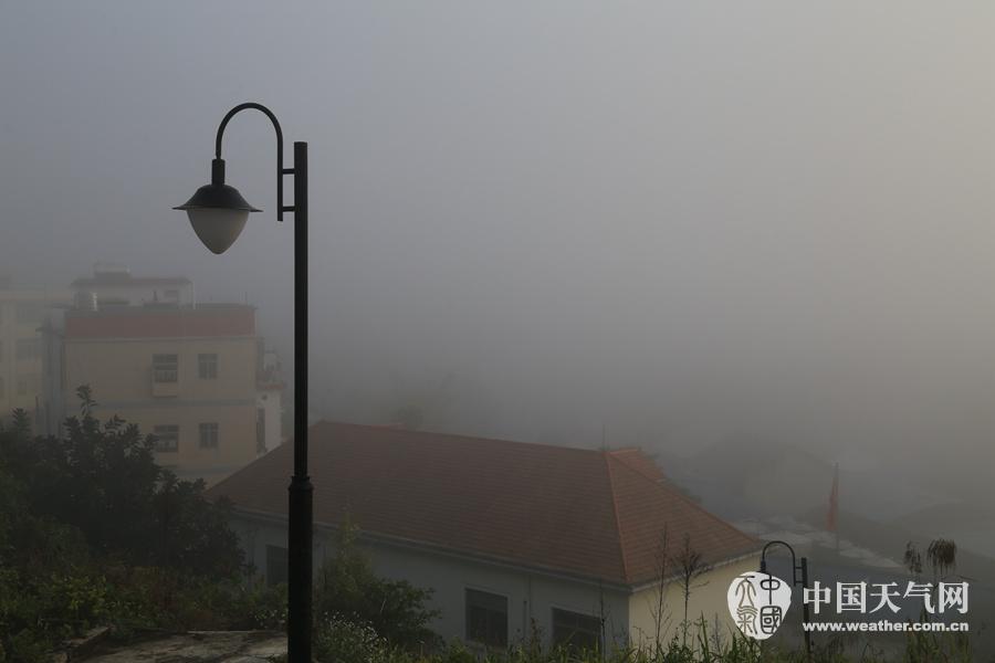 巴马的早晨,远处的县城完全消失在大雾中。(摄影:卢保英)
