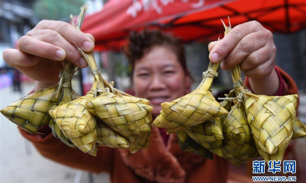 12月20日,在广西靖西市小城故事小区,村民在展示香糯粽子。(摄影:陆波岸)