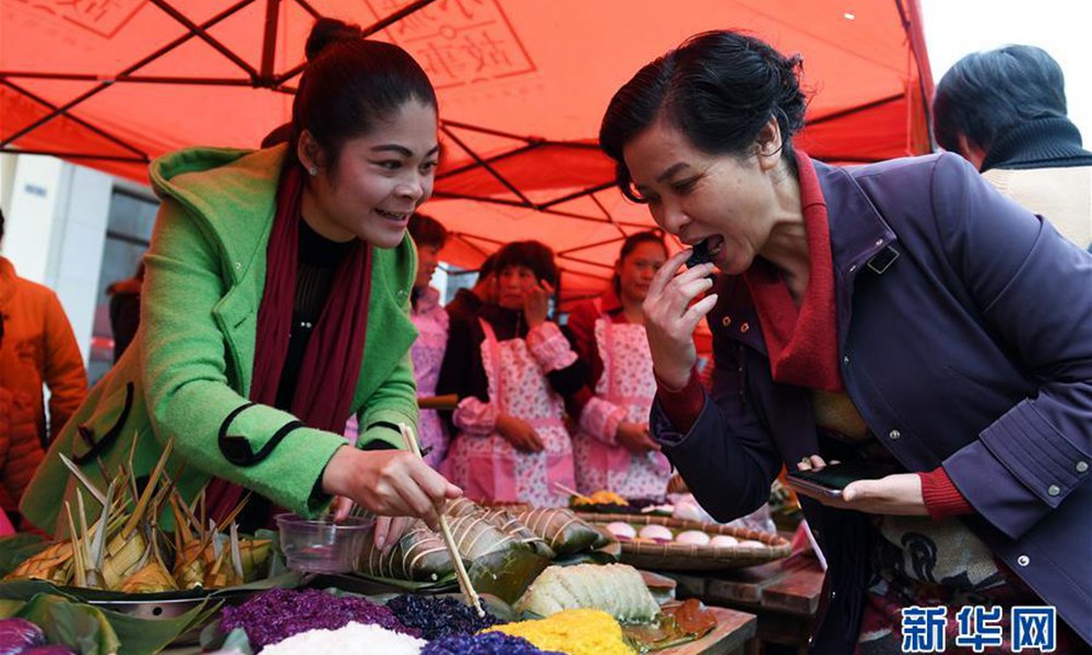 12月20日,在广西靖西市小城故事小区,市民(右)在品尝展示的香糯五色饭。(摄影:陆波岸)