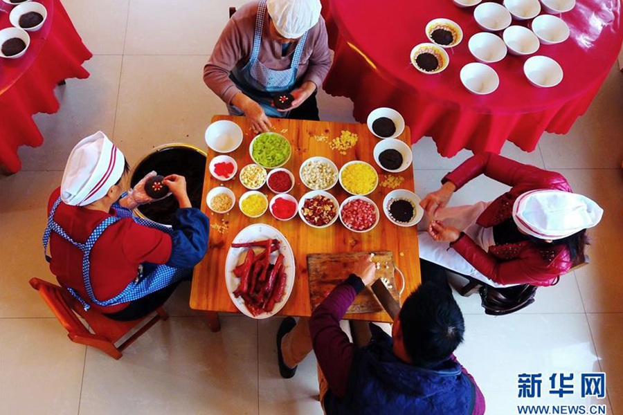 1月6日,广西宜州市怀远镇居民在制作八宝饭。 “怀远八宝饭”是广西宜州市怀远镇的招牌美食,在当地有着悠久的制作历史。每年腊月里,家家户户都开始制作喷香四溢的八宝饭,寓意“八宝呈祥”,喜迎新春佳节。新华社发(高东风 摄)