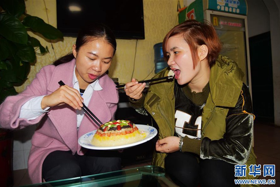 1月6日,两名游客品尝广西宜州“怀远八宝饭”。 新华社发(高东风 摄)