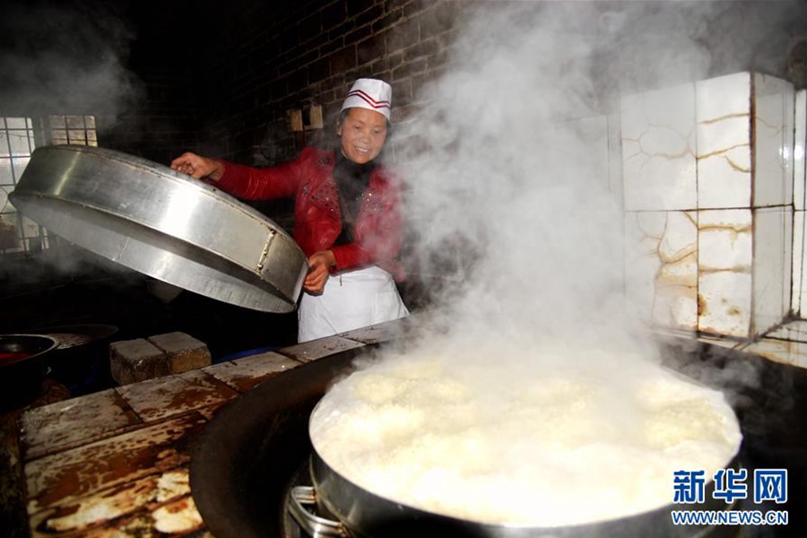 1月6日,在广西宜州市怀远镇,“怀远八宝饭”制作艺人韦秀新蒸制八宝饭用到的糯米。新华社发(高东风 摄)