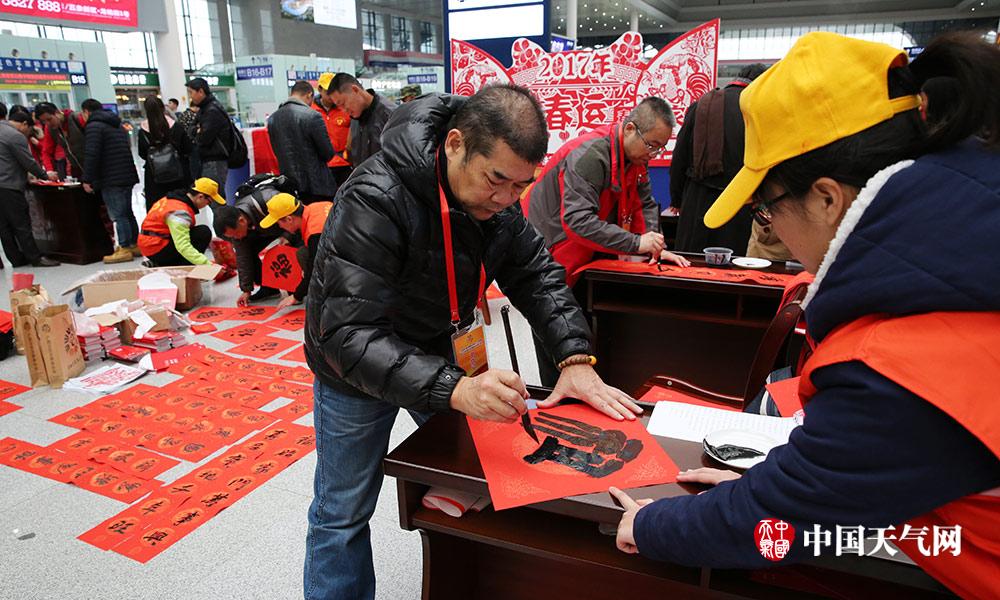 春运首日,南宁铁路公安处组织开展了“写对联、送字符、贺新春”活动,用特别的方式为旅客送上新年祝福。(摄影:刘英轶)