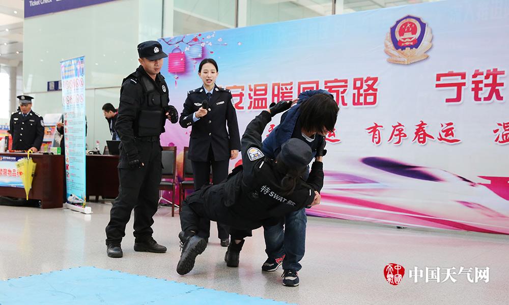为了确保旅客平安回家,在南宁火车东站,南宁铁路公安处女特警现场传授“防身术”,详细解说示范,并与旅客现场互动,亲身教学。(摄影:刘英轶)