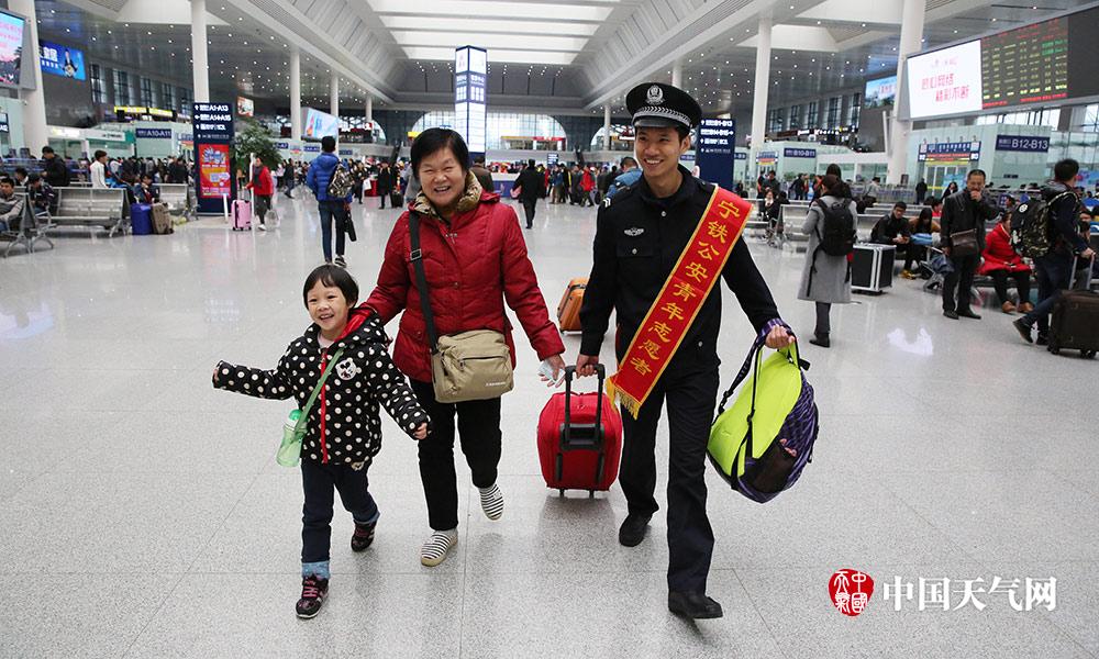 南宁铁路公安青年志愿者为匆匆赶车的旅客提行李。(摄影:刘英轶)