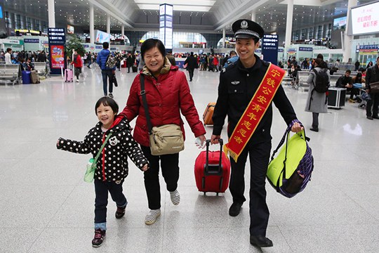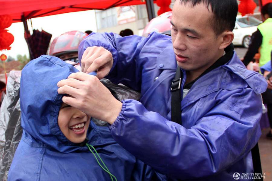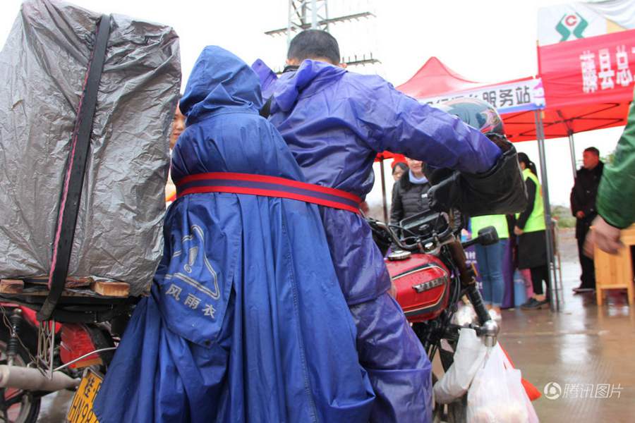 春运第一天,气温降到12℃左右,还下着小雨,公路上又湿又滑。姐姐小郭随父亲走进驿站休息,她和弟弟坐摩托车回老家过年。