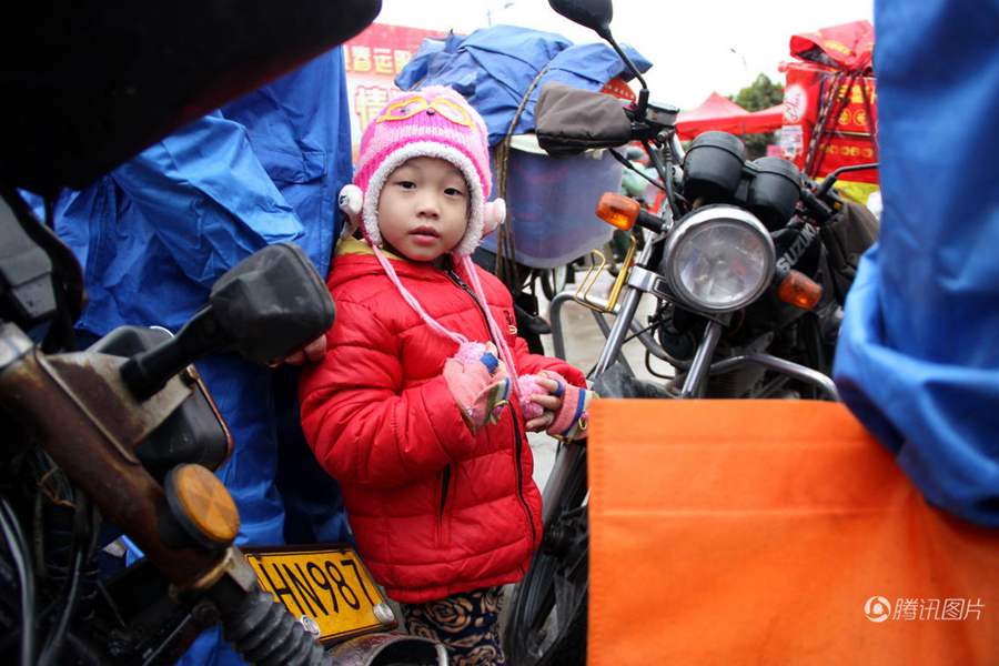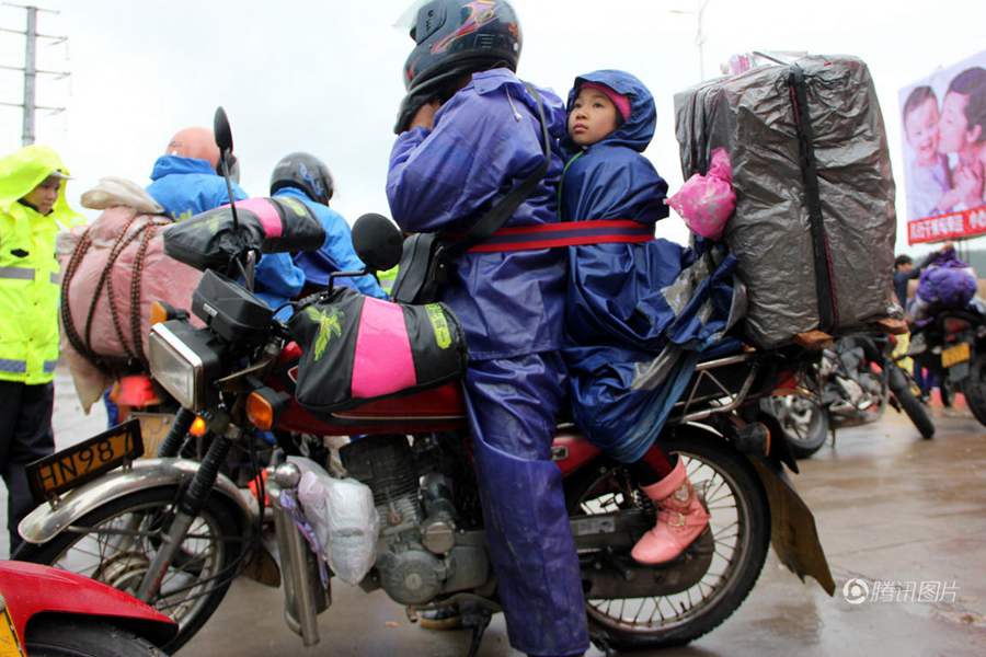 姐姐小郭绑在父亲腰间,身后还有一大箱行李。春节过后,“小候鸟”会再度跟随家人,乘“铁骑”赶往广东务工。在数十万“铁骑大军”少则几百、多则上千公里的来回征程中,跟随父母长途迁徙的孩子就像鸟巢中的雏鸟一样,在年复一年的迁徙中慢慢长大成人。