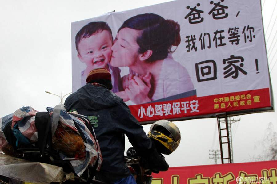 公益广告牌上写着“爸爸,我们在等你回家”字样。长途骑行,愿每个车手顺利到家过个平安年。