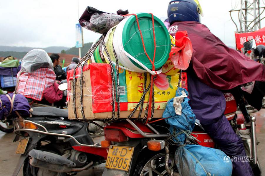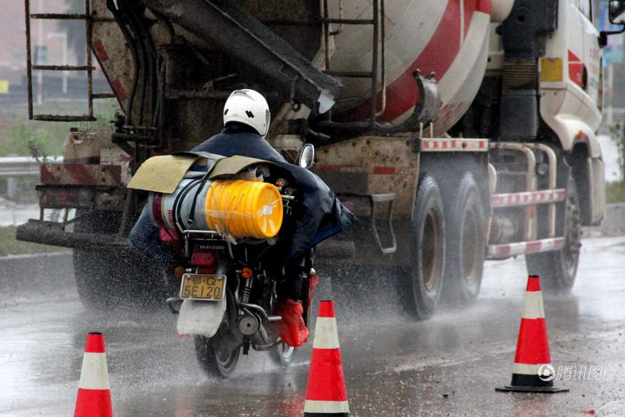 车手风雨兼程赶回老家与家人团圆,驶过的车辆溅到他们一身泥浆。