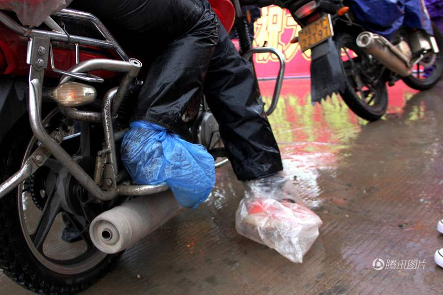 骑手们双脚缠着塑料袋子,防寒防雨。