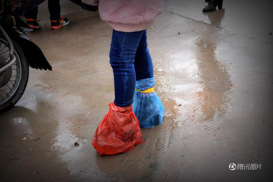 虽然披了雨衣,缠着塑料袋,疾风仍不时将雨衣掀起,细雨打湿了她们的小腿。